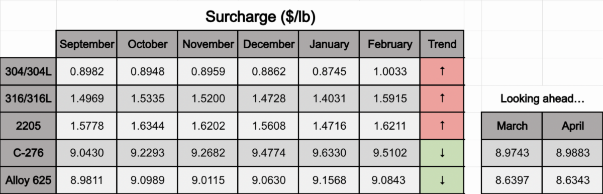 Nickel Prices have had an interesting ride over the past three decades, with a low of $2.20/lb. in October 2001 (following the September 11 events) and a high of $23.72/lb. in May 2007. Surcharges trail Nickel prices by approximately two months, so they would have been at their lowest in December 2001 (304 was $0.0182/lb.) and peak in July 2007 (304 was $2.2839/lb.).